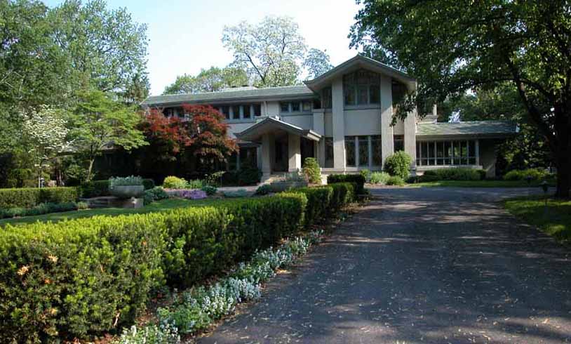William Allin Storrer tells a very interesting story of this house. This home was designed in 1909 and was the last home that Wright worked on before leaving for Europe with Mamah Cheney. It was one of the few homes where Wright was given a complete free hand. He designed the home, the furnishings and even the uniforms worn by the servants. Construction on the home started in 1910 and was overseen by Marion Mahony and Hermann von Holst who worked in Wright’s firm and took up many of his commissions after he skipped town for Europe. Walter Burley Griffin designed the landscape for the home. There were some changes made to the design in Wright’s absensce.